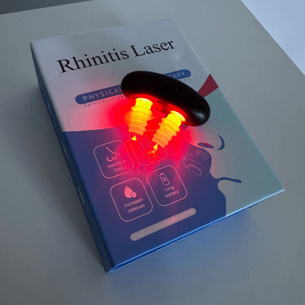 It uses low-level laser therapy to reduce inflammation in your nasal passages, helping to relieve allergy symptoms like congestion, sneezing, and runny nose.